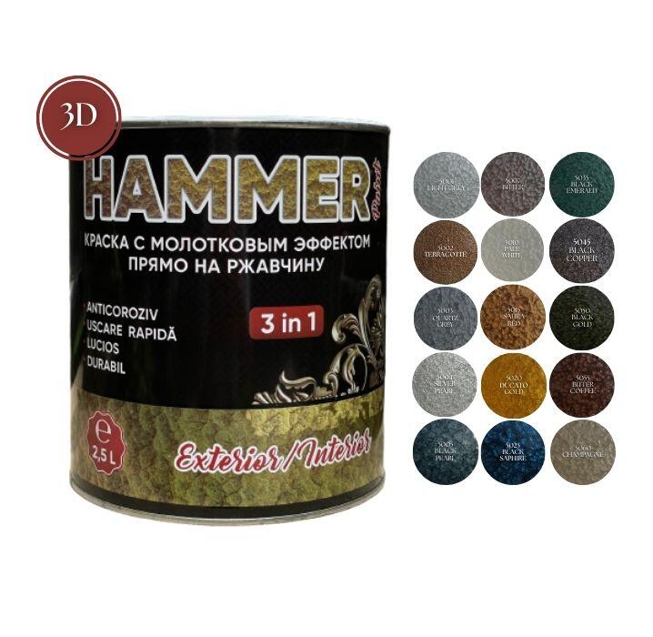 HAMMER PAINT 3D 3 în 1 – Vopsea cu aspect lucios și cu uscare rapidă care redă efectul “lovitură de ciocan”, pe bază de solvenți și rășini sintetice, aditivi speciali și pigmenți anticorozivi.